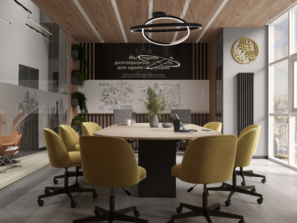 Пространство освежили зеленью, а так же яркой мебелью в фирменных цветах компании. В стену встроили шкаф для хранения документов и подарков для гостей.